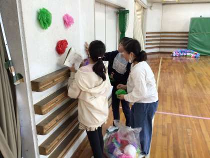 2枚目 ノートに書いてある飾りつけプランを確認しながら紙花を飾っていました。