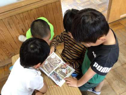 2年生教室では、朝の会が始まる前に、たくさんの仲間でアリが戦う本を見て盛り上がっていました。
