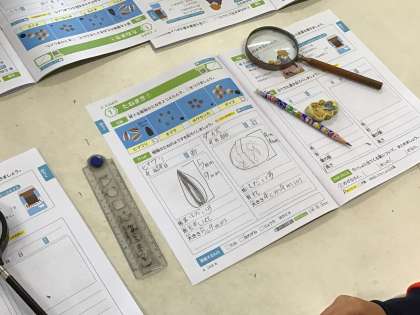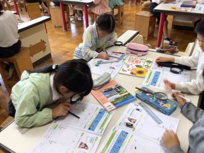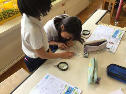 1枚目 ホウセンカの小さなタネを虫メガネで観察しています。