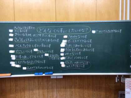 もうすぐ4月が終わり、飯野小学校に入学して1ヶ月が経ちます。学校生活にもだいぶ慣れてきました。学級の目標を決めるために、今日はみんなでどんなクラスにしたいかを考えました。友達と真剣に話し合い、素敵な意見がたくさん出ました。