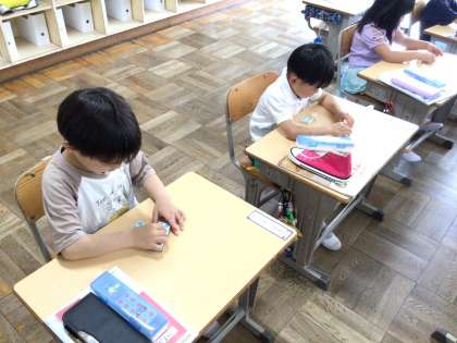 3枚目 並べたら、また手はおひざです。この緊張感が素晴らしいです。入学後、1ヶ月で大成長しました!こんな姿を見ることができて、とてもうれしいです。