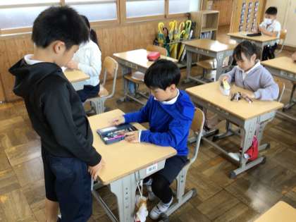 朝の会の時間に学級代表が筆箱チェックをしています。鉛筆が削られているか、必要な学習用具は揃っているかを確認して学習環境を整えています。