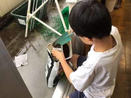 理科の授業で、観察のためにツルレイシを植えました。芽がでるようにお世話をしていきます。