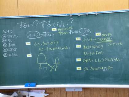 道徳の授業です。木の実を誰がたくさん取れるか競争しようとするも、みんな身長が違います。台の数が同じがいいのか、台の数を人によって変えるのか熱く討論していました。