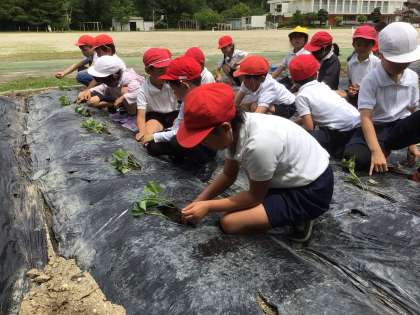 5/16 さつまいも、夏野菜の苗を畑に植えました 公開日 2024/05/16 更新日 2024/05/16 第2学年の様子 昨日、芋の苗を1年生と植えました。自分の苗が植え終わると1年生の手伝いする!と自然に声が出る素敵な子どもたちでした。 夏野菜は、かぼちゃとナスを植えました。実がたくさんなるといいなと思います。 2年