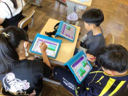 総合的な学習の時間にscratchを使ってゲームやアニメーションを作っています。3年生の時に紙芝居を作った経験を活かして、今日はプログラミングを使って思い通りにキャラクターを動かす練習をしました。
