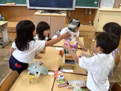 みんなが集めて持ってきた箱を、似ているところを見つけて仲間分けしました。