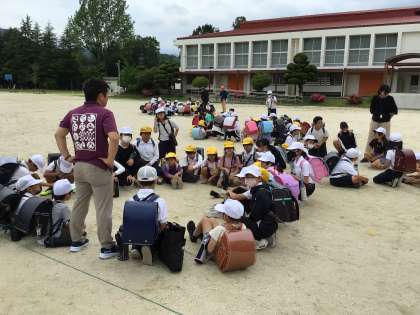 登下校中の安全を再確認するために、臨時で通学団会を行いました。