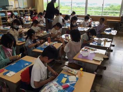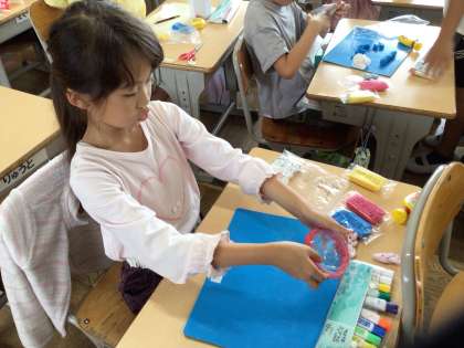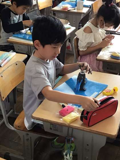 紙ねんどを使って、空き容器を変身させます。形や使う目的からイメージして作成していました。