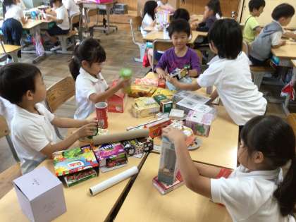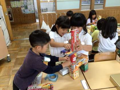 ご家庭で集めていただいた箱や缶を使って、グループ毎に、思い付いた物を協力して作りました。