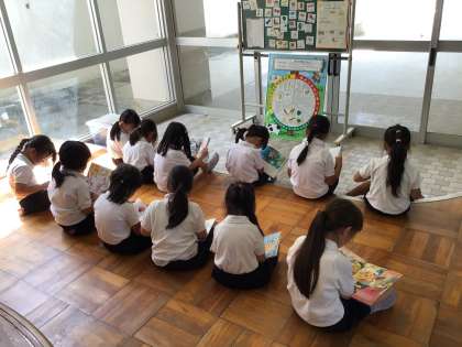 順番待ちをしている1年生が、静かに座って読書をしていました。