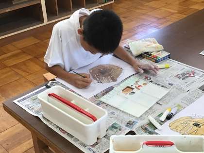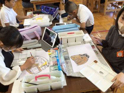 図工で大谷選手からいただいたグローブのデッサンをしています。もうすぐ完成です。