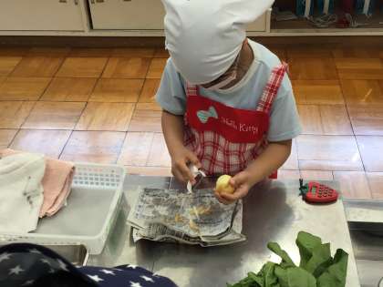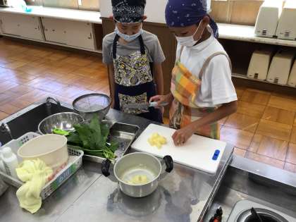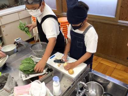 6/11 5年生 調理実習 その2 公開日 2024/06/11 更新日 2024/06/11 活動の記録(その他) 野菜を切っています。 普段、家で包丁を使ってジャガイモの皮をむいているという子もいて、驚きました。 校長