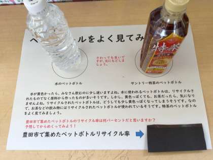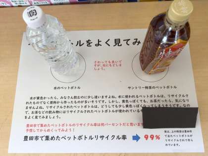 4年生の先生から聞いた話では、豊田市とサントリーが協定を結び、ペットボトルのリサイクルに取り組んでいるそうです。