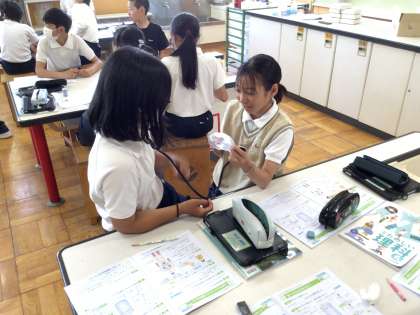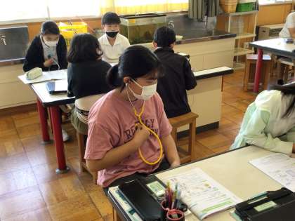理科の授業で自分の心臓に聴診器を当て、心音を聞きました。