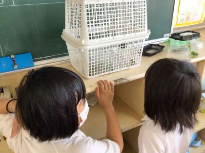 長いさなぎ期間だったので、「さなぎの中で死んじゃった?」と心配していましたが、ようやく成虫になりました。モンシロチョウと比べたときの大きさに驚いていました。