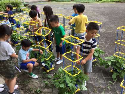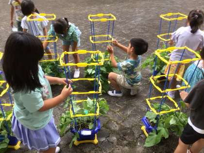 この土日でまた一気に大きくなったあさがお。つるが伸びてきたので、支柱を立てました。