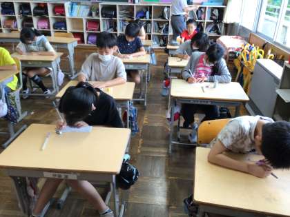 漢字のミニテストの様子です。毎回漢字ドリルにテスト勉強をしてきてから行います。