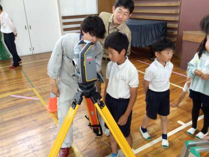 6/25 4年生 測量体験 公開日 2024/06/25 更新日 2024/06/25 活動の記録(その他) 愛知県測量設計業協会 測量委員会が実施する測量体験と地図教室に参加しました。 体育館で本物の測量機器を使ってボールの落下点や目標物までの距離を測定しました。 校長