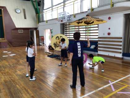 歌舞伎体験会 その1 公開日 2024/06/25 更新日 2024/06/25 第3学年の様子 総合で歌舞伎を調べたりセリフを練習したりしてきました。その集大成として藤岡歌舞伎の方々に来ていただき、セリフの言い方や見得を習いました。傘や腕の動かし方に苦戦しながらもその難しさを楽しむ姿が見られました。 3年
