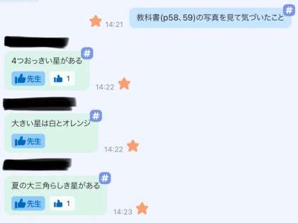 6/28 「星の明るさと色」 公開日 2024/06/28 更新日 2024/06/28 第4学年の様子 新しい単元のはじめに、星に関する知識や解釈について「気づきメモ」という機能を使って共有しました。挙手をして発言することも大切ですが、この機能では「時間がなくてあててもらえなかった」といったことがなかったり、発言が苦手な子も自分の考えや意見をみんなに簡単に伝えることができます。今日の授業では全員意見を書くことができていました。 4年