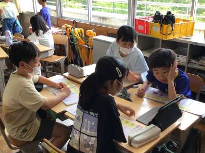 班ごとに書き順や読み方をタブレットを使って確認しています。