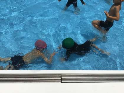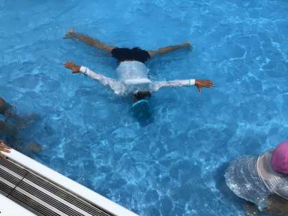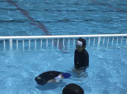 「お水大好きカード」の技に挑戦しています。バディのお友達と潜ったり浮いたりするなどの技ができているかをチェックし合っています。