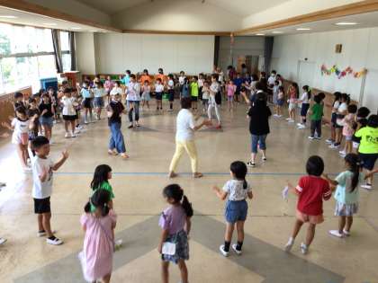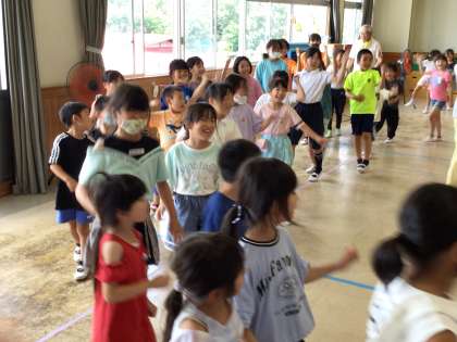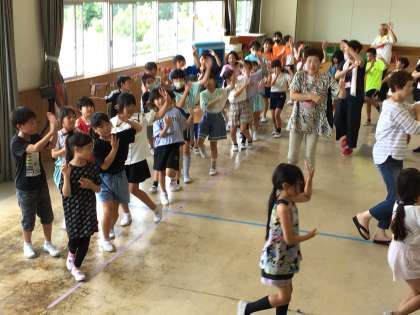 午後業間、11人のボランティアを迎え、ふじっ子ホールで藤岡音頭を踊りました。