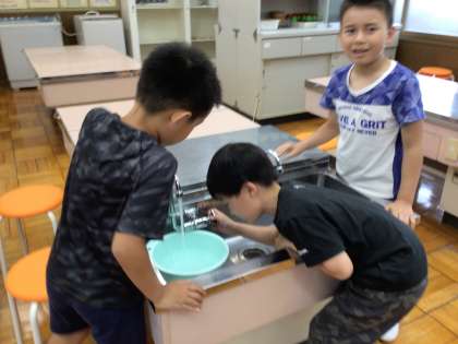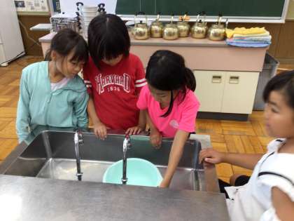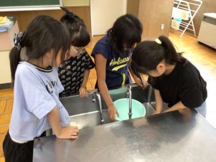 7/8 かさの学習 その1 公開日 2024/07/08 更新日 2024/07/08 第2学年の様子 今日は、家庭科室で授業をしました。学校にあるなべ、やかん、ボウルなどのかさを測りました。 はじめに1Lはどのくらいかを検討しました。 その後に、水の量を計量カップで測りました。予想した量に近いと嬉しそうでした。 2年