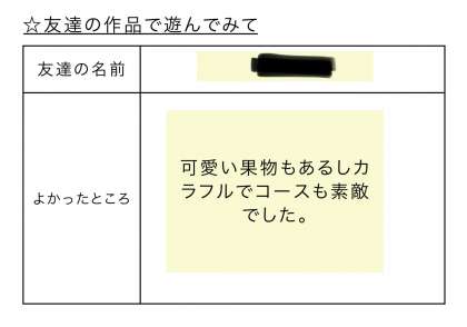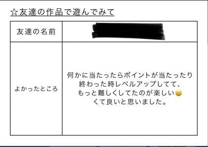 7/9 コロコロガーレ その2 公開日 2024/07/09 更新日 2024/07/09 第4学年の様子 友だちの作品で遊んでみて、ただ楽しむだけでなく、よかったと思う作品についてまとめました。友だちからのコメントを読んで、今後の励みにしていきます。