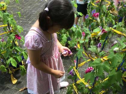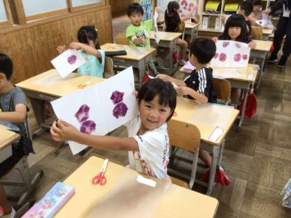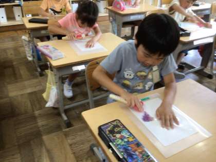 あさがおの花を使ってこすり染めをしました。摘んだ花を習字紙に挟んでクリアファイルに入れ、はさみの持ち手部分でこすります。開くと、きれいに色が出ていて感動でした。