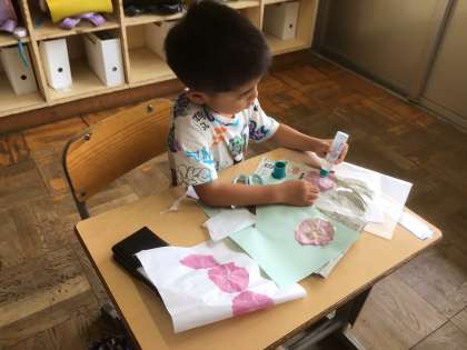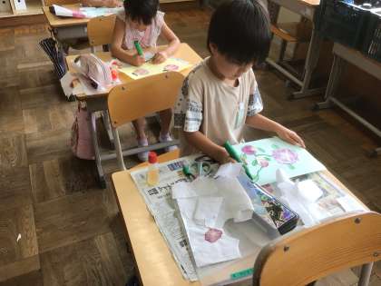 7/18 あさがおのこすり染めを使って(1年) 公開日 2024/07/18 更新日 2024/07/18 第1学年の様子 先週作ったあさがおのこすり染めを、思い思いに色紙に貼り付けました。ラミネートして、きれいなあさがおの花を思い出に残します。夏休みもおうちであさがおのお世話を頑張ってくださいね。
