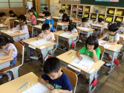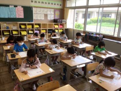 夏休み課題の確認テストをしました。久しぶりの登校でしたが、みんな集中して解いています。