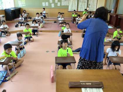9/4 3年生 音楽 公開日 2024/09/04 更新日 2024/09/04 校長室から 夏休み中に音楽室の床を張り替えました。 カーペットからラバーになりました。 ピンク色の床で3年生がリコーダーの練習をしていました。 先生の手本を真剣なまなざしで見ている姿が印象的でした。 【めざす子ども像 し:真剣に勉強する子】 校長