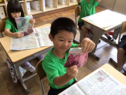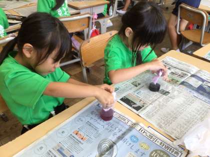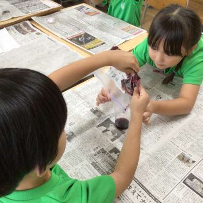 9/10 生活「あさがおの色水遊び」(1年) 公開日 2024/09/10 更新日 2024/09/10 第1学年の様子 夏休み中にご家庭で冷凍保存していただいたあさがおを使って、色水遊びをしました。色水に2種類の魔法の粉(クエン酸・重曹)を入れると…色が変わりました!その2種類の色水を混ぜたら…しゅわしゅわ泡が出てきました!色水染めもして楽しみました。