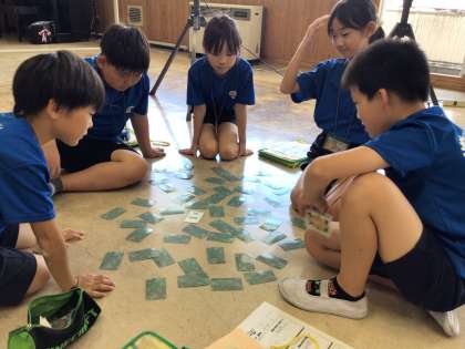 9/10 愛・シンパシーワークショップ 公開日 2024/09/11 更新日 2024/09/11 第4学年の様子 4月から年間通して学習している環境について、今回は森の生き物になりきって気持ちを考えました。神経衰弱のようなカードゲームをしながら、「人間がいない世界」と「人間がいる世界」での動物たちの生活の変化を実感することができました。振り返りでは、動物たちを守るために自分たちができることについて考えていました。 4年
