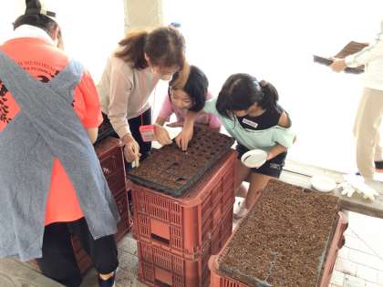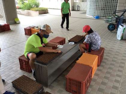 11人の花ボランティアと30人の子どもで春花壇の種まきをしました。