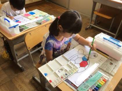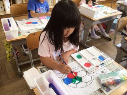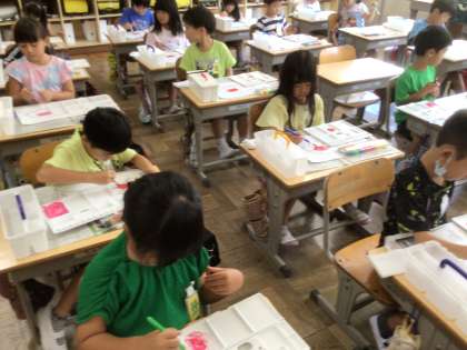 9/12 図工「初めての絵の具」(1年) 公開日 2024/09/12 更新日 2024/09/12 第1学年の様子 絵の具の使い方を学習しました。亀の甲羅をひとつずつはみ出さないように、丁寧に塗りました。