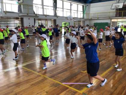 初めての中学年合同練習です。先におどりの練習を始めた4年生が見本をみせ、一緒に練習しました。