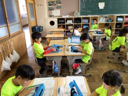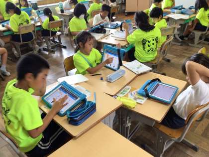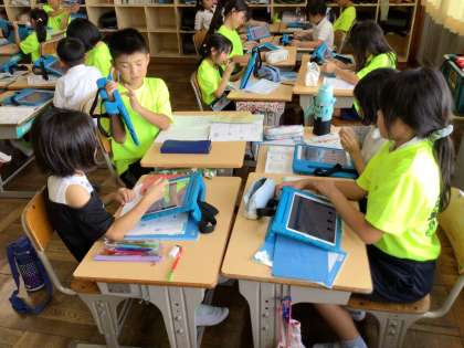 タブレットを使って、あまりのあるわり算の考え方をグループで伝え合いました。画面を見せたり、指を指したり、自分のタブレットに友達の画面を共有して自分の考えを伝える姿が見られました。