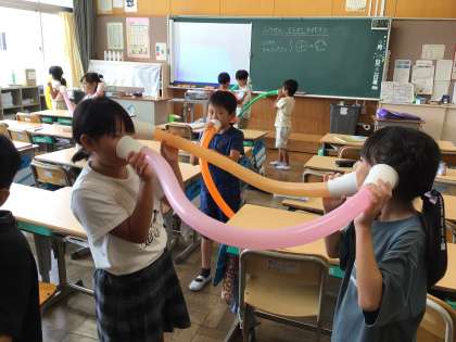 9/20 風船電話を作りました 公開日 2024/09/20 更新日 2024/09/20 第2学年の様子 風船と紙コップで糸電話の代わりに風船電話を作りました。 たくさん遊んだことが3年生の理科の学習にもつながるといいなと思います。 2年