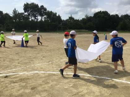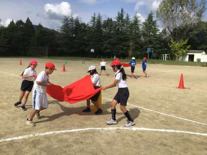 3・4年生合同で運動会の競遊の練習をしました。今日は動きの確認と退場の練習をしました。今後の練習でチームでの作戦を考えていきます。どんな種目か写真の様子からぜひご想像ください。