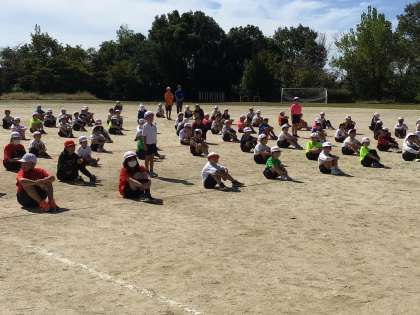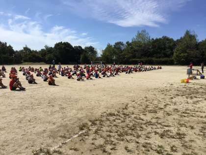 運動会の全校練習のため運動場で前期終業式を行いました。