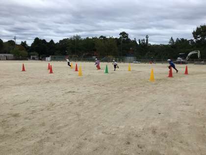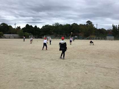 運動会が終わってからの体育の授業では「キックベース」をします。今日はその前段階として、走ったり、サッカーボールでキャッチボールをしたり、ボールをける練習をしました。