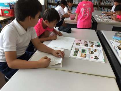 国語の「「どうぶつカード」を作ろう」の学習で図鑑を使ってどうぶつについて調べてました。図鑑の索引、目次をつかって調べることができるようになりました。