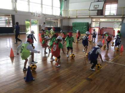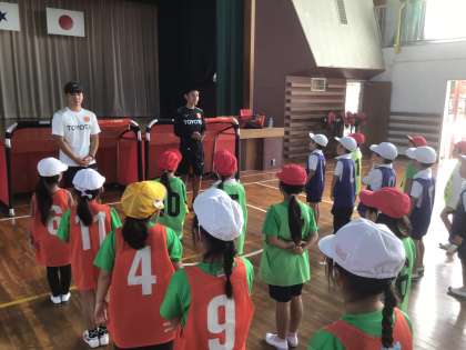 名古屋グランパスエイトのコーチにサッカーを教えていただきました。基本練習をした後、男女別で試合もしました。最後にノートもプレゼントしていただきました。