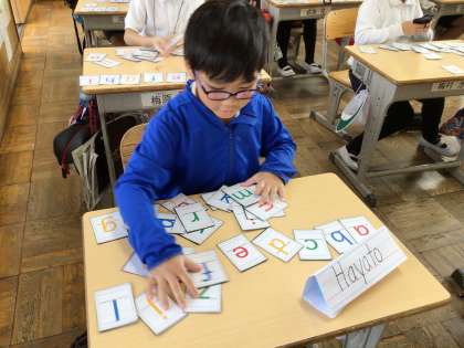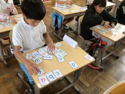今日からアルファベットの勉強が始まりました。大文字のアルファベットは3年生で学習しているので、歌はみんな上手に歌うことができていました。似ている形の小文字に気をつけながらカードを並べ替えました。