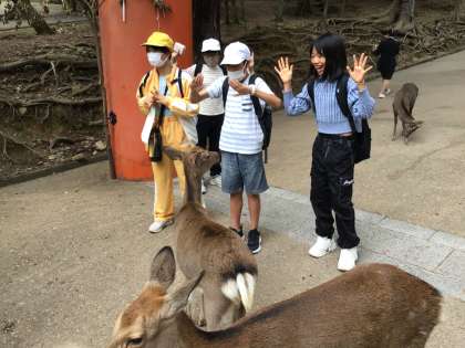 11/5 6年生 修学旅行17 公開日 2024/11/05 更新日 2024/11/05 校長室から 鹿に降参中です。 班別活動が始まりました。 鹿せんべいをあげると鹿が群がってきます。 せんべいがなくなった後、両手をあげて降参しないと、気性の激しい鹿は頭突きをします。 校長