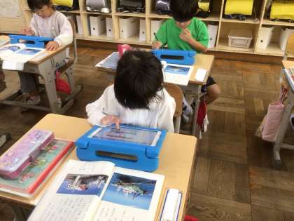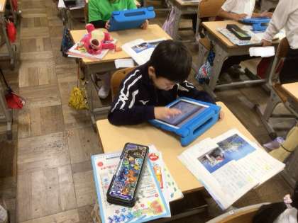 説明文「いろいろなふね」を読んで、それぞれの船の役目・つくり・できることを読み取り、タブレットにまとめています。タブレットの文字入力もだいぶ速くできるようになってきました。