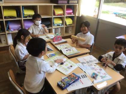 タンブリン、カスタネット、トライアングル、すず、ウッドブロックの正しい鳴らし方を確認し音色の違いを楽しみました。